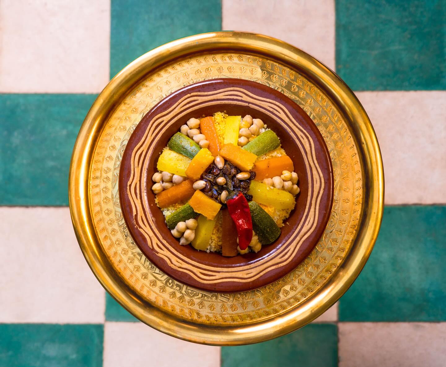 Couscous aux légumes et Tfaïa (oignons et raisins secs)